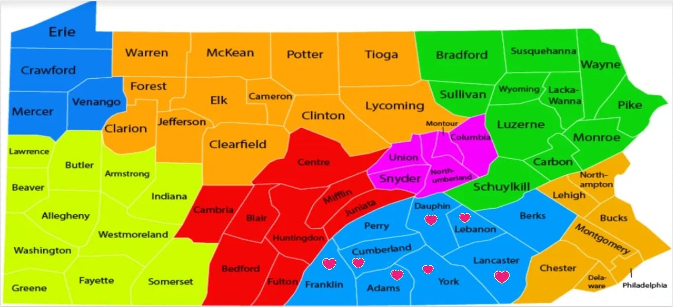 York, Adams, Franklin, Cumberland, Dauphin, Lancaster, Lebanon.